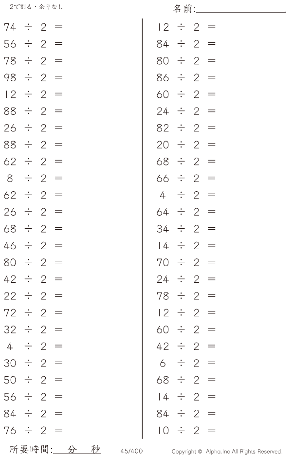 上記のボタンから「2で割る・余りなし」の算数数学ドリル・計算ドリル(PDFプリント)がダウンロードできます。個人利用は無料です(家庭以外での配布は有料です)。