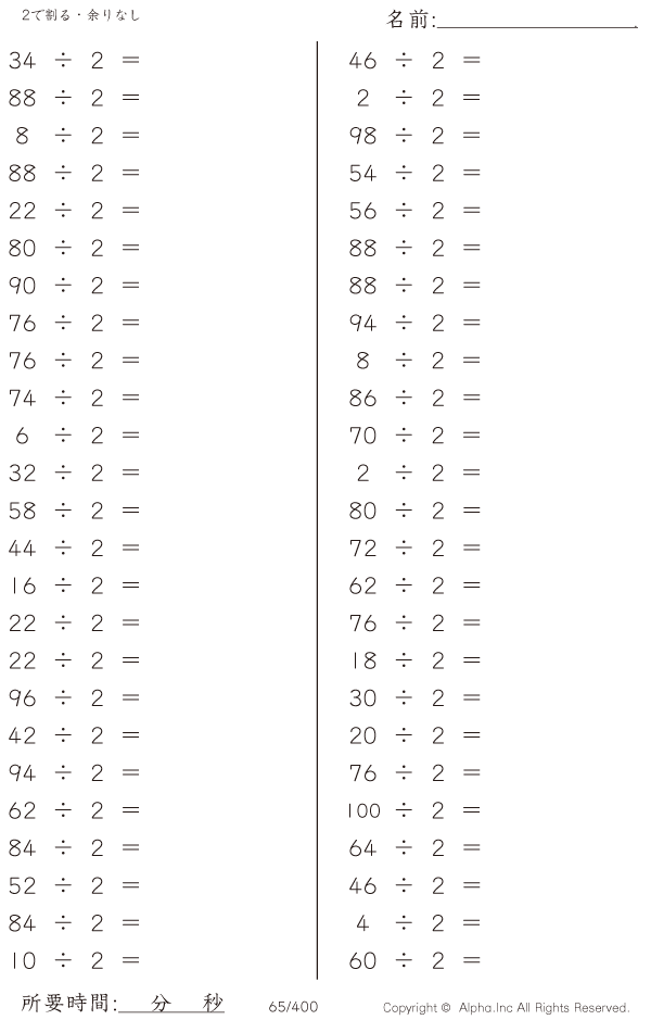 上記のボタンから「2で割る・余りなし」の算数数学ドリル・計算ドリル(PDFプリント)がダウンロードできます。個人利用は無料です(家庭以外での配布は有料です)。
