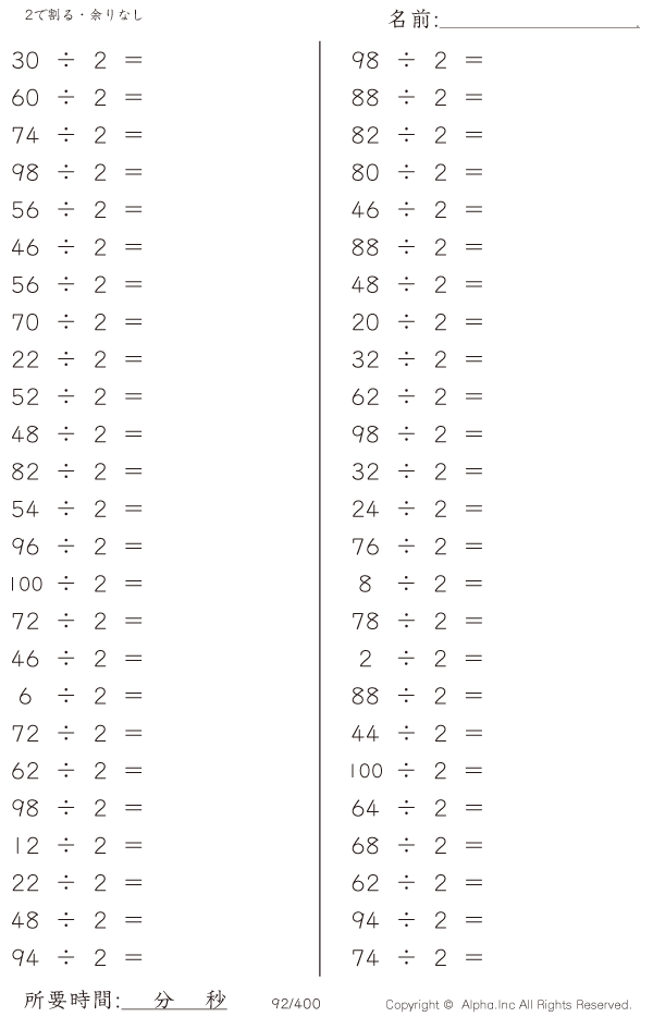 上記のボタンから「2で割る・余りなし」の算数数学ドリル・計算ドリル(PDFプリント)がダウンロードできます。個人利用は無料です(家庭以外での配布は有料です)。
