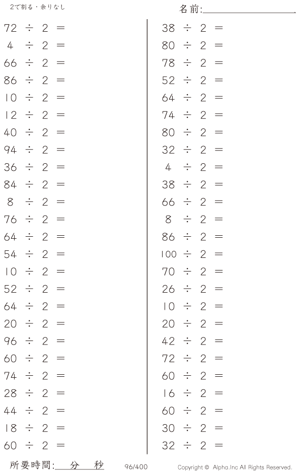上記のボタンから「2で割る・余りなし」の算数数学ドリル・計算ドリル(PDFプリント)がダウンロードできます。個人利用は無料です(家庭以外での配布は有料です)。