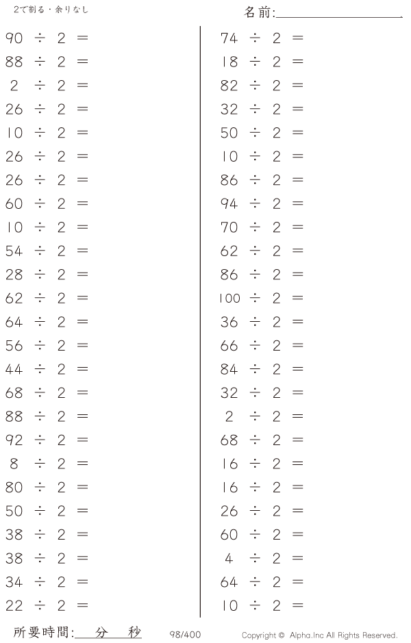 上記のボタンから「2で割る・余りなし」の算数数学ドリル・計算ドリル(PDFプリント)がダウンロードできます。個人利用は無料です(家庭以外での配布は有料です)。