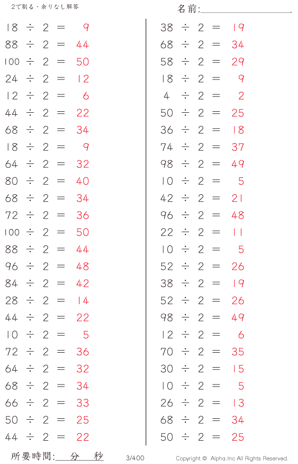 上記のボタンから「2で割る・余りなし」の算数数学ドリル・計算ドリル(PDFプリント)がダウンロードできます。個人利用は無料です(家庭以外での配布は有料です)。