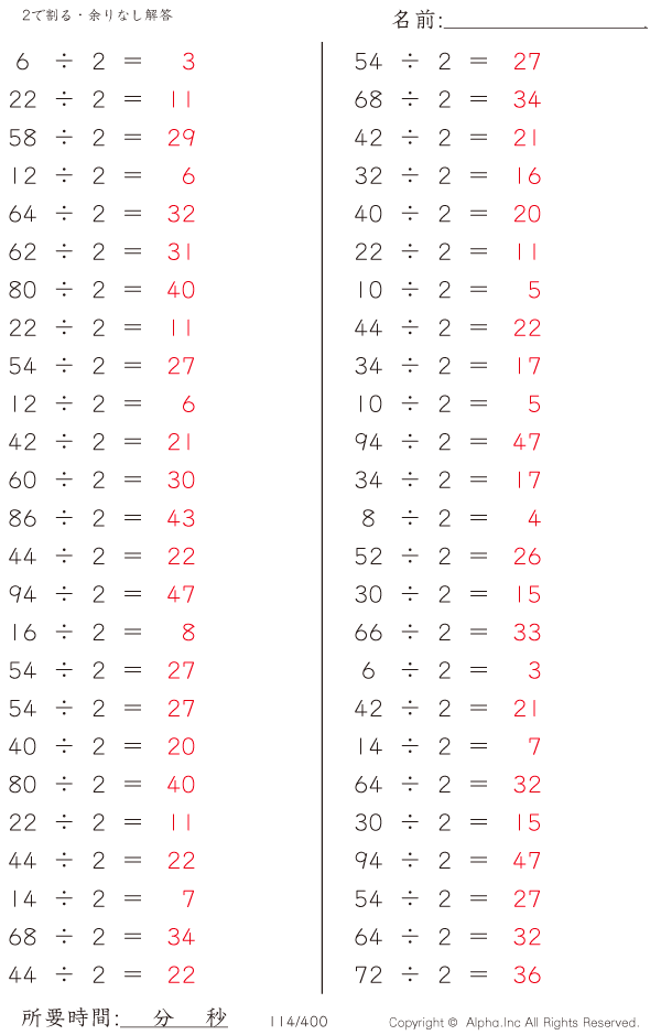 上記のボタンから「2で割る・余りなし」の算数数学ドリル・計算ドリル(PDFプリント)がダウンロードできます。個人利用は無料です(家庭以外での配布は有料です)。