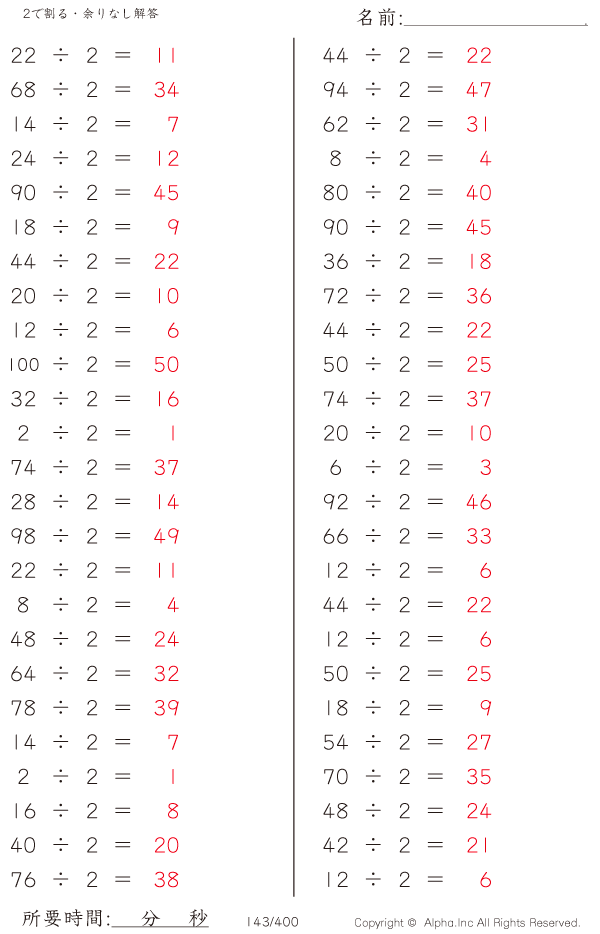 上記のボタンから「2で割る・余りなし」の算数数学ドリル・計算ドリル(PDFプリント)がダウンロードできます。個人利用は無料です(家庭以外での配布は有料です)。