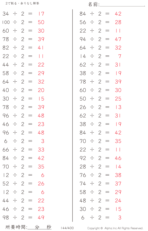 上記のボタンから「2で割る・余りなし」の算数数学ドリル・計算ドリル(PDFプリント)がダウンロードできます。個人利用は無料です(家庭以外での配布は有料です)。