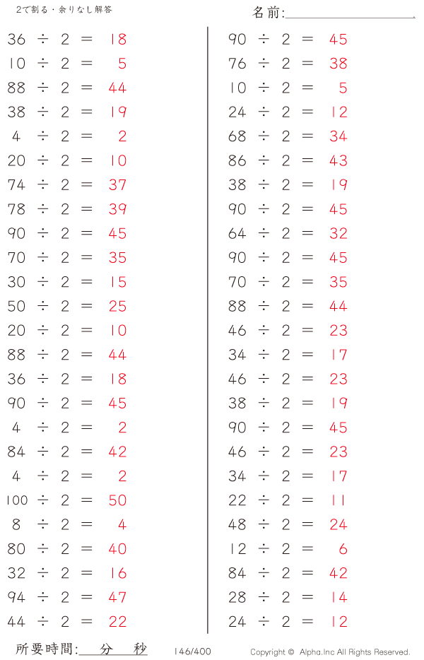 上記のボタンから「2で割る・余りなし」の算数数学ドリル・計算ドリル(PDFプリント)がダウンロードできます。個人利用は無料です(家庭以外での配布は有料です)。