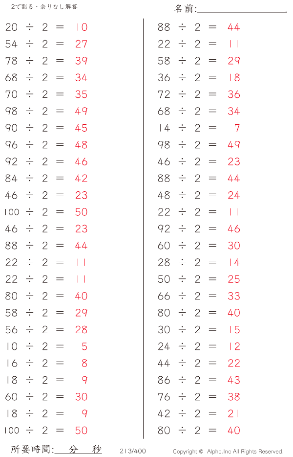 上記のボタンから「2で割る・余りなし」の算数数学ドリル・計算ドリル(PDFプリント)がダウンロードできます。個人利用は無料です(家庭以外での配布は有料です)。