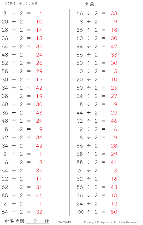 上記のボタンから「2で割る・余りなし」の算数数学ドリル・計算ドリル(PDFプリント)がダウンロードできます。個人利用は無料です(家庭以外での配布は有料です)。