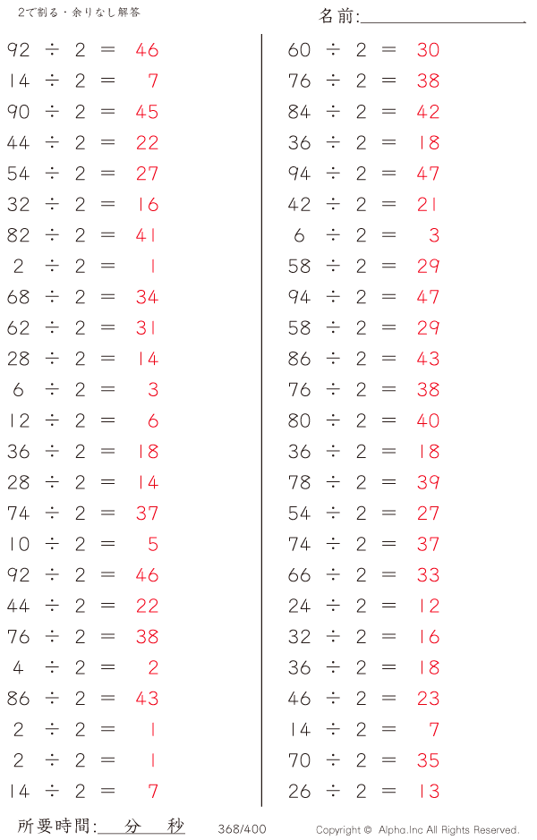 上記のボタンから「2で割る・余りなし」の算数数学ドリル・計算ドリル(PDFプリント)がダウンロードできます。個人利用は無料です(家庭以外での配布は有料です)。