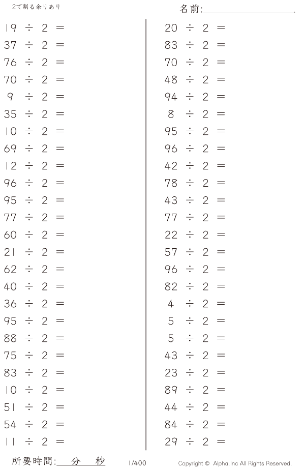 上記のボタンから「2で割る・余りあり」の算数数学ドリル・計算ドリル(PDFプリント)がダウンロードできます。個人利用は無料です(家庭以外での配布は有料です)。