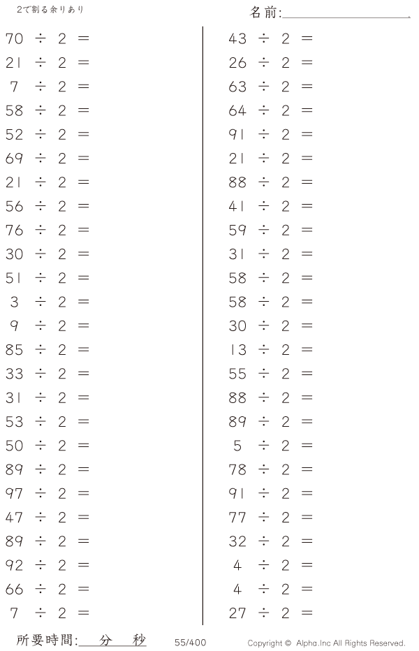 上記のボタンから「2で割る・余りあり」の算数数学ドリル・計算ドリル(PDFプリント)がダウンロードできます。個人利用は無料です(家庭以外での配布は有料です)。