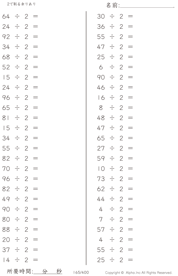 上記のボタンから「2で割る・余りあり」の算数数学ドリル・計算ドリル(PDFプリント)がダウンロードできます。個人利用は無料です(家庭以外での配布は有料です)。