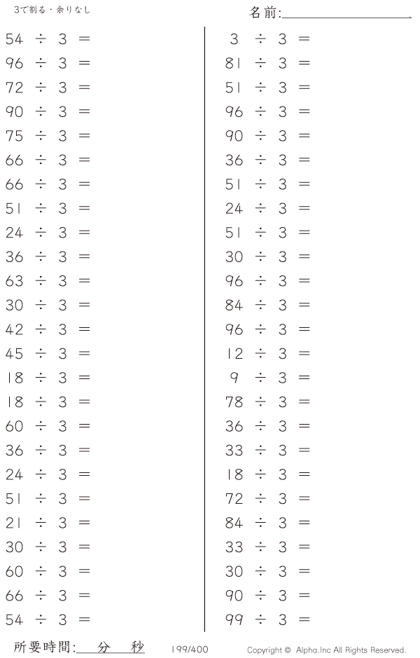 上記のボタンから「3で割る・余りなし」の算数数学ドリル・計算ドリル(PDFプリント)がダウンロードできます。個人利用は無料です(家庭以外での配布は有料です)。
