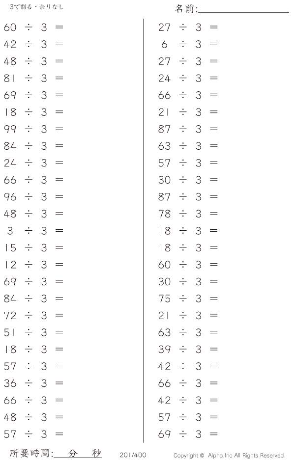 上記のボタンから「3で割る・余りなし」の算数数学ドリル・計算ドリル(PDFプリント)がダウンロードできます。個人利用は無料です(家庭以外での配布は有料です)。