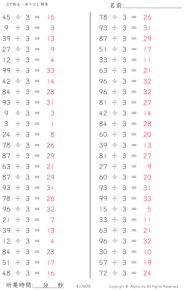 上記のボタンから「3で割る・余りなし」の算数数学ドリル・計算ドリル(PDFプリント)がダウンロードできます。個人利用は無料です(家庭以外での配布は有料です)。