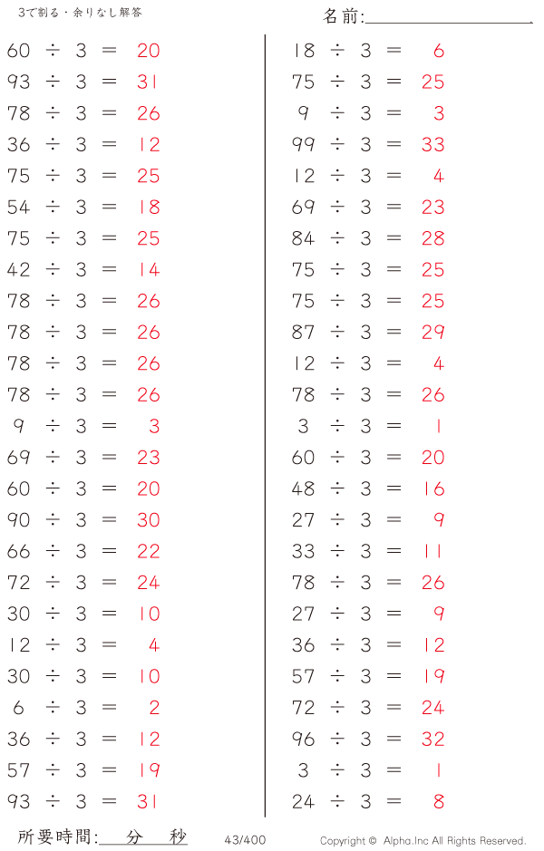 上記のボタンから「3で割る・余りなし」の算数数学ドリル・計算ドリル(PDFプリント)がダウンロードできます。個人利用は無料です(家庭以外での配布は有料です)。
