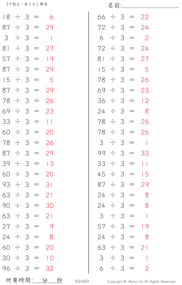 上記のボタンから「3で割る・余りなし」の算数数学ドリル・計算ドリル(PDFプリント)がダウンロードできます。個人利用は無料です(家庭以外での配布は有料です)。
