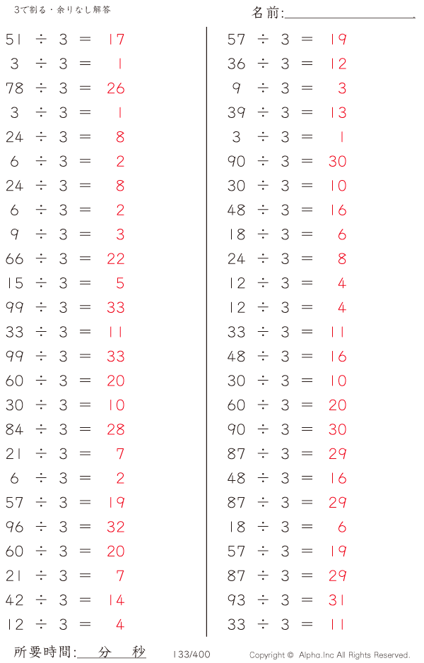 上記のボタンから「3で割る・余りなし」の算数数学ドリル・計算ドリル(PDFプリント)がダウンロードできます。個人利用は無料です(家庭以外での配布は有料です)。