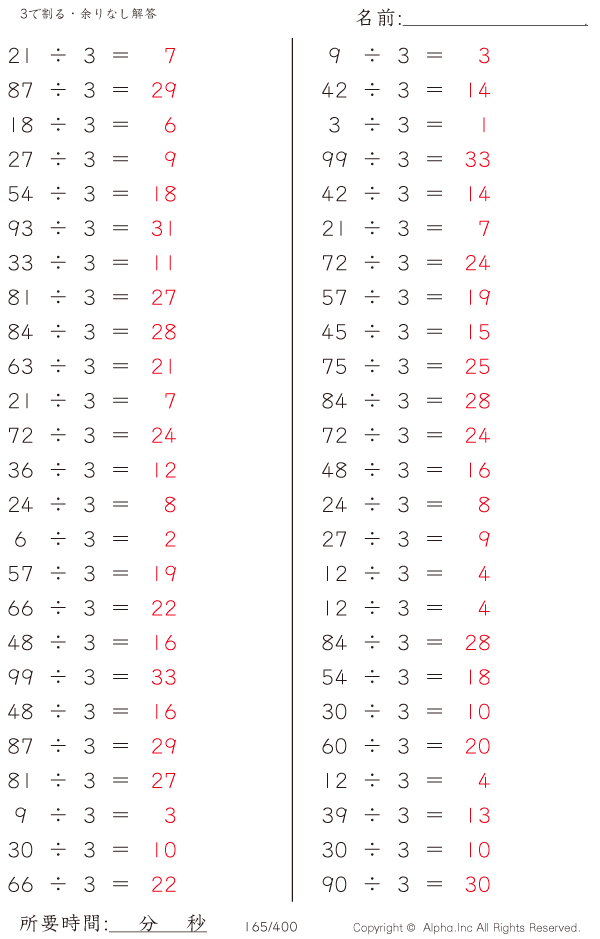 上記のボタンから「3で割る・余りなし」の算数数学ドリル・計算ドリル(PDFプリント)がダウンロードできます。個人利用は無料です(家庭以外での配布は有料です)。