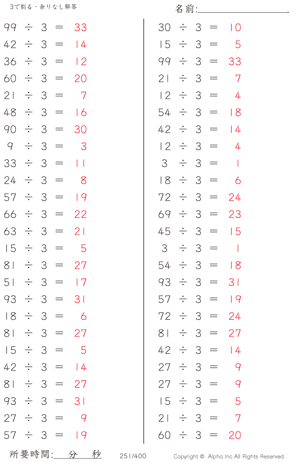 上記のボタンから「3で割る・余りなし」の算数数学ドリル・計算ドリル(PDFプリント)がダウンロードできます。個人利用は無料です(家庭以外での配布は有料です)。
