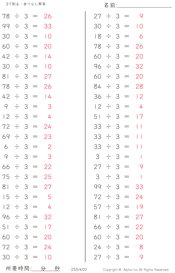 上記のボタンから「3で割る・余りなし」の算数数学ドリル・計算ドリル(PDFプリント)がダウンロードできます。個人利用は無料です(家庭以外での配布は有料です)。