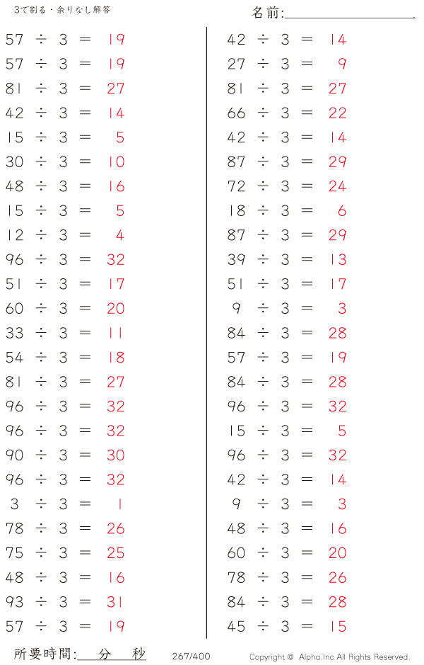 上記のボタンから「3で割る・余りなし」の算数数学ドリル・計算ドリル(PDFプリント)がダウンロードできます。個人利用は無料です(家庭以外での配布は有料です)。