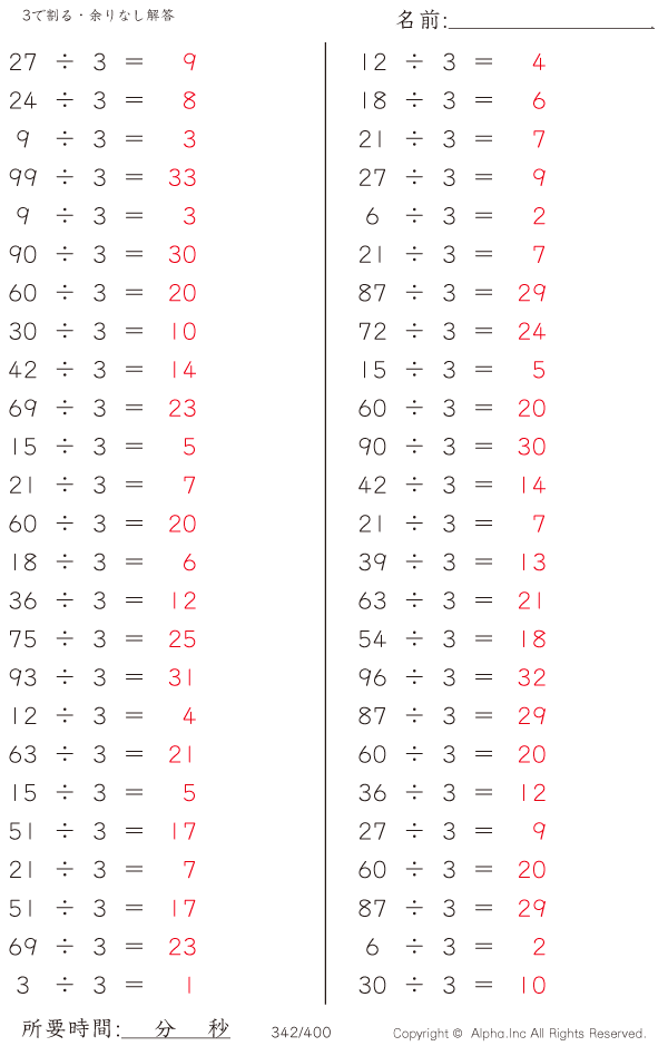 上記のボタンから「3で割る・余りなし」の算数数学ドリル・計算ドリル(PDFプリント)がダウンロードできます。個人利用は無料です(家庭以外での配布は有料です)。