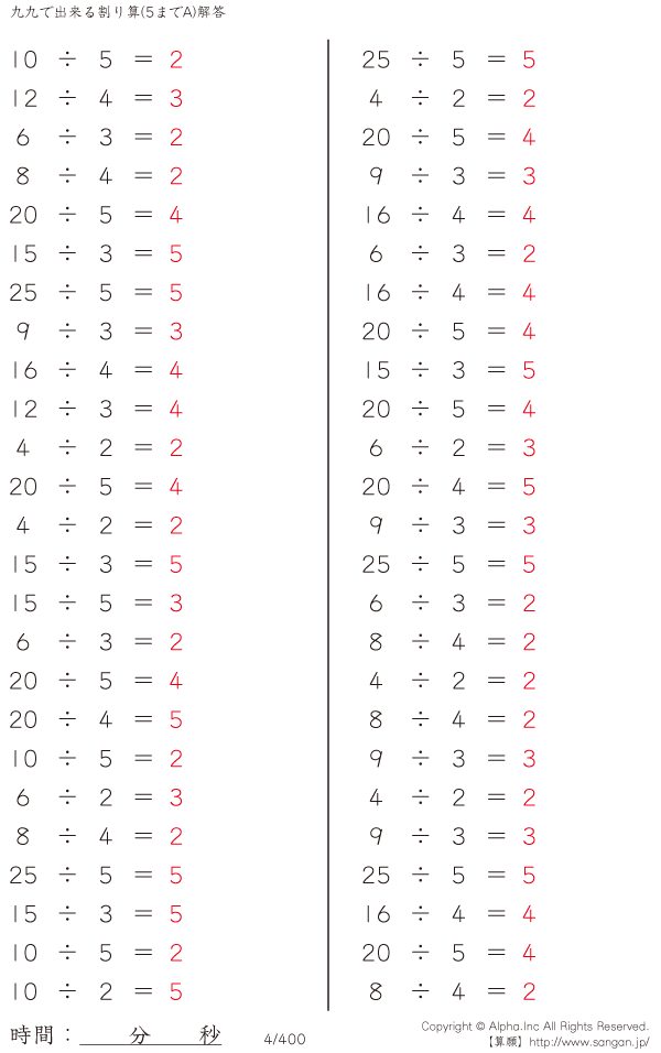 上記のボタンから「九九でできる割り算(5までA・」の算数数学ドリル・計算ドリル(PDFプリント)がダウンロードできます。個人利用は無料です(家庭以外での配布は有料です)。
