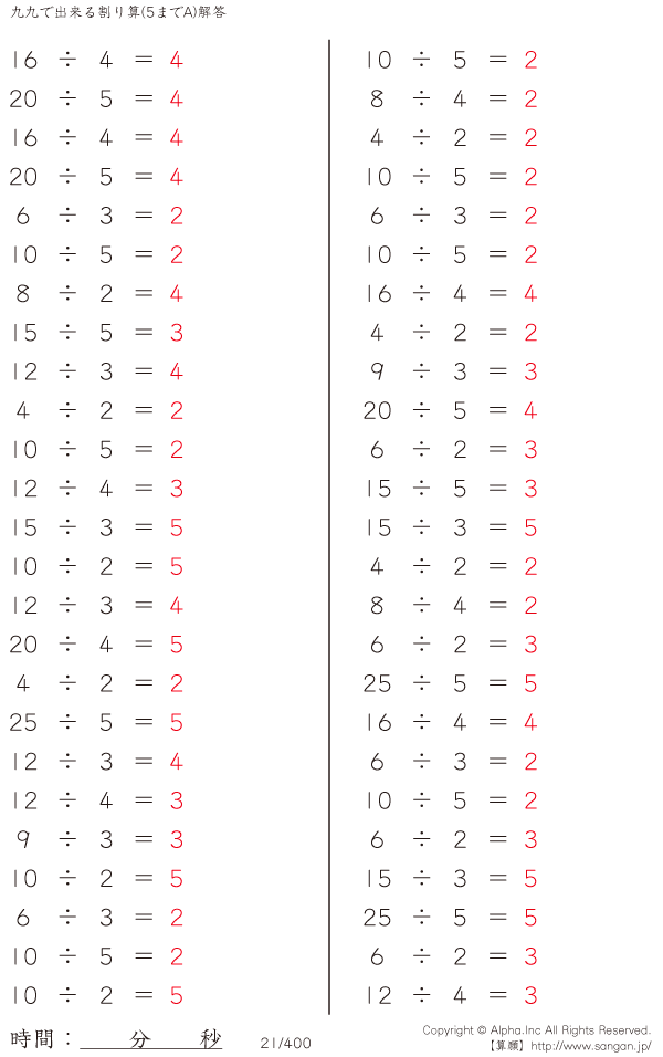 上記のボタンから「九九でできる割り算(5までA・」の算数数学ドリル・計算ドリル(PDFプリント)がダウンロードできます。個人利用は無料です(家庭以外での配布は有料です)。