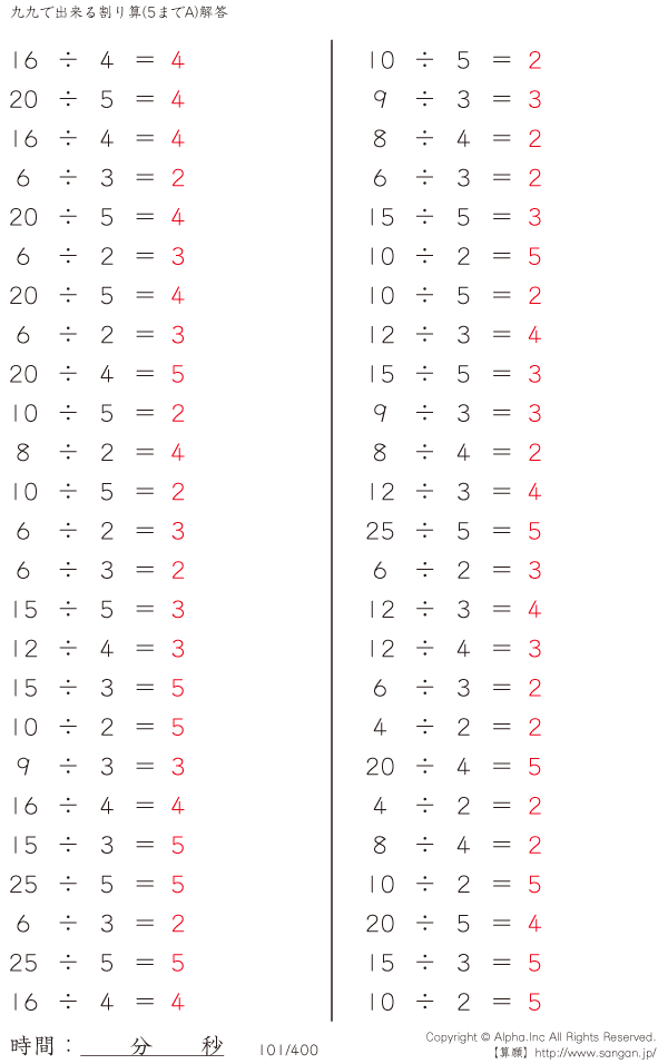 上記のボタンから「九九でできる割り算(5までA・」の算数数学ドリル・計算ドリル(PDFプリント)がダウンロードできます。個人利用は無料です(家庭以外での配布は有料です)。