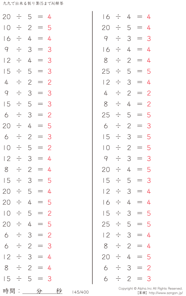 上記のボタンから「九九でできる割り算(5までA・」の算数数学ドリル・計算ドリル(PDFプリント)がダウンロードできます。個人利用は無料です(家庭以外での配布は有料です)。