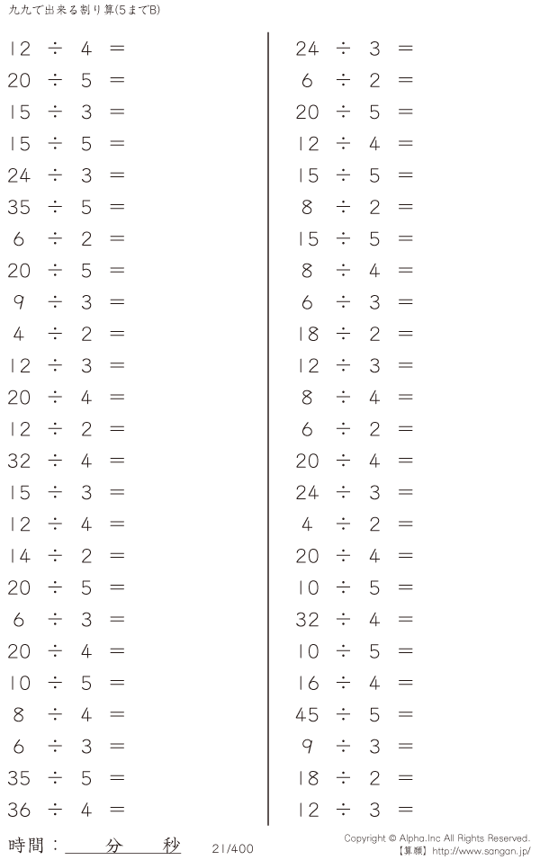 上記のボタンから「九九でできる割り算(5までB・」の算数数学ドリル・計算ドリル(PDFプリント)がダウンロードできます。個人利用は無料です(家庭以外での配布は有料です)。