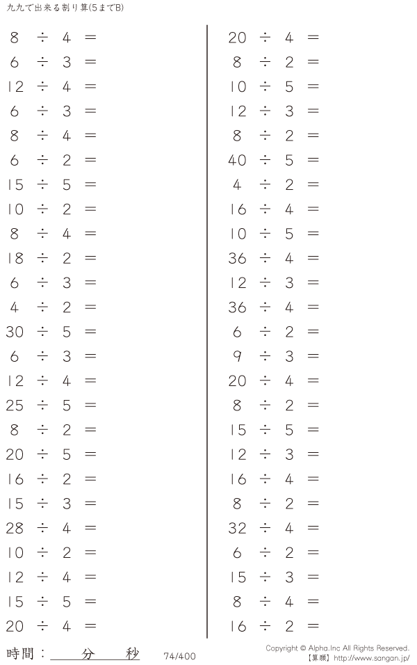 上記のボタンから「九九でできる割り算(5までB・」の算数数学ドリル・計算ドリル(PDFプリント)がダウンロードできます。個人利用は無料です(家庭以外での配布は有料です)。
